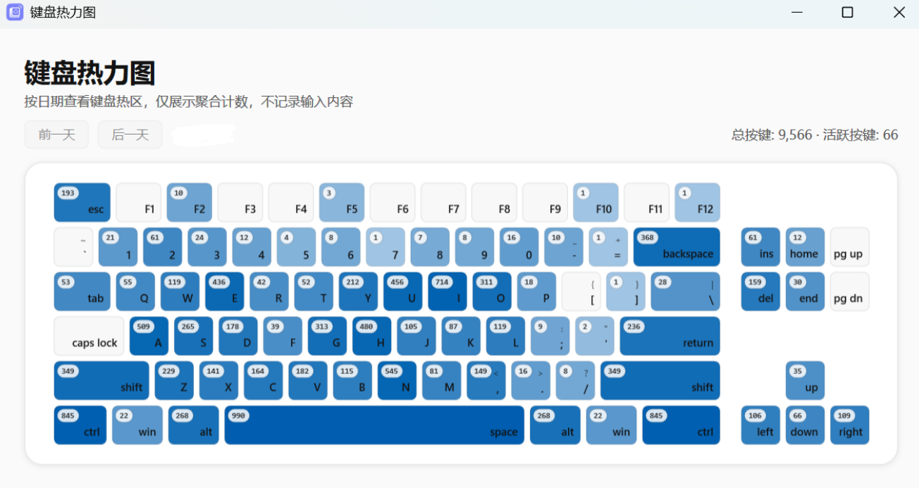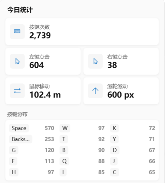 键盘按键统计更是让人大呼过瘾。你可以清晰地看到自己每天敲击次数最多的按键是哪些。经常码字的小伙伴,空格键和退格键绝对是重灾区。