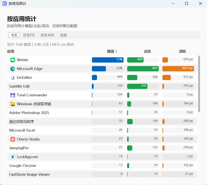 不仅如此,它还能帮你进行活跃应用统计。哪个软件里键盘敲得最狠,哪个软件里鼠标用得最多,它都给你安排得明明白白。比如软妹就发现自己其实是聊天的微信和码字的浏览器使用次数最多。