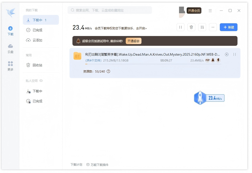 这才是重点!阿刚实测下来,这个版本的下载体验可以用“惊艳”来形容。在下载一些热门电影资源时,速度能稳定维持在20MB/s以上,直接跑满带宽。最搞笑的是,下载界面上会一直显示“超级会员加速中,剩余60s”,仿佛卡了一个无限加速的BUG。虽然对于死链资源它也无力回天,但对于绝大多数BT任务,它的表现甚至超过了很多国外的下载神器。