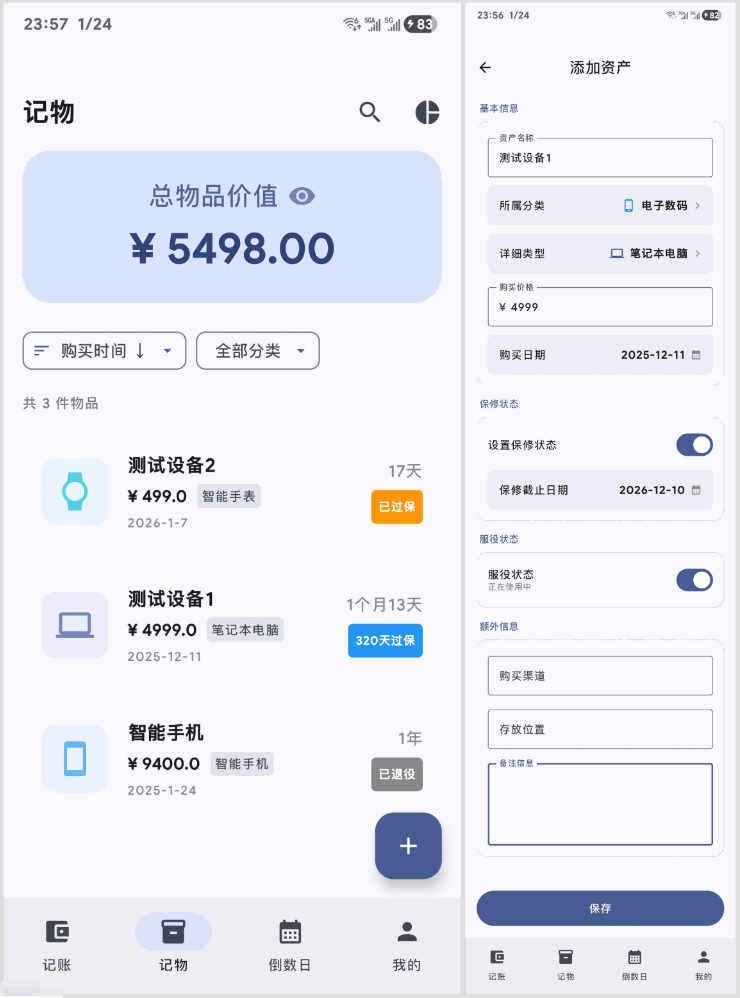 除了记账,作者还顺手塞进了两个极其好用的功能。首先是“记物”功能,这简直是整理控和健忘星人的福音。你可以把家里的重要物品、收藏品或者借出去的东西记录下来,标注好存放位置和数量。下次再找不到东西,打开App搜一下就知道它在哪个抽屉吃灰了。