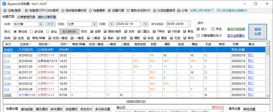根据12306的规则,一旦有退票产生,系统会优先满足候补订单,但依然会有余票释放到公海池。Bypass的作用就是帮你省去手动刷新的机械劳动,在余票释放的毫秒级黄金时间内,通过分流技术帮你抢占先机。比手速,人类永远跑不过代码;比耐心,软件永远不会累。