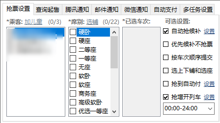 这是最关键的一步。你需要配置乘车人、席位和车次。强烈建议大家多选几个车次和席别,比如把临近时间段的高铁、动车甚至普速列车都勾选上,这样能大大增加命中的几率。你还可以设置高铁和动车的选座偏好,以及开启自动支付功能。